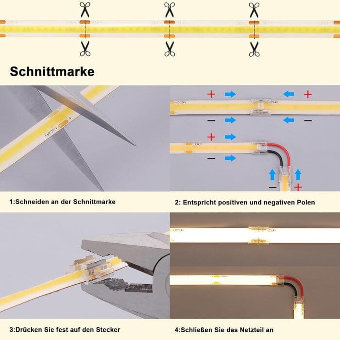 Die Handhabung & Eignung des Sets erweist sich im Test als praxistauglich. Die Soft-Start-Funktion des Netzteils lässt den Streifen sanft anlaufen und verhindert Spannungsspitzen beim Einschalten. Der 4-stufige DIP-Dimmer ermöglicht eine einfache Helligkeitsanpassung direkt am Netzteil ohne zusätzliche Steuereinheit. Das Kürzen des Streifens gelingt werkzeugfrei und ohne Beschädigung der Silikonhülle. Das Schnittintervall von 20 cm schränkt jedoch die Anpassungsgenauigkeit bei kurzen Installationsstrecken ein — für kleinteilige Projekte mit präzisen Längenanforderungen ist das Konfektionierungsspielraum eingeschränkt für solche Anwendungen. Das Anschlusskabel von 1,2 m erfordert bei größeren Abständen zwischen Netzteil und Installationsbeginn eine Verlängerung.