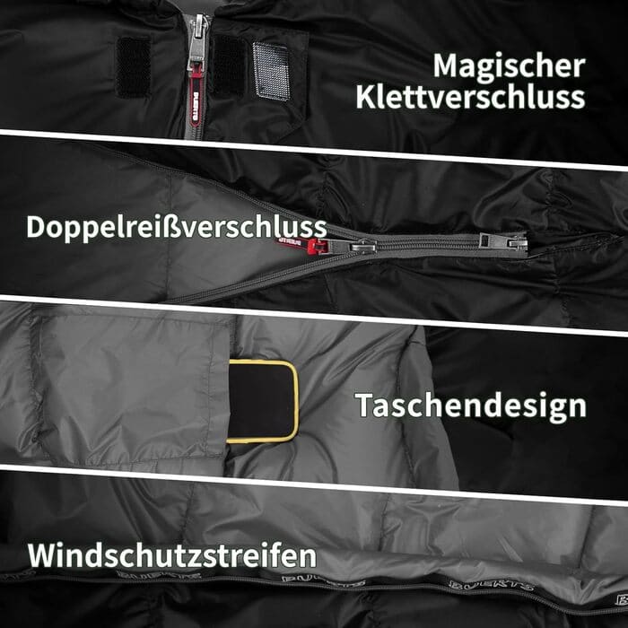 Die Handhabung überzeugt durch einen flüssig laufenden Reißverschluss, der sich ohne Verhaken öffnen und schließen lässt. Die Kapuze ist einhändig verstellbar, der integrierte Klemmschutz verhindert das Einklemmen von Stoff. Ein separater Fußreißverschluss erlaubt gezielte Temperaturregulierung, während die beidseitige Reißverschluss-Konfiguration die Kopplung mit einem zweiten Schlafsack zum Doppelmodell ermöglicht. Scharfe Kanten oder abstehende Metallteile sind nicht spürbar. Die CE-Kennzeichnung erfüllt EU-Anforderungen, versiegelte Nähte und antistatische Eigenschaften tragen zur Alltagstauglichkeit bei. Eingeschränkt zeigt sich die Wasserresistenz: Die DWR-Imprägnierung bietet Spritzwasserschutz, eine IPX-Zertifizierung fehlt jedoch – bei anhaltendem Regen stößt das Material an seine Grenzen.