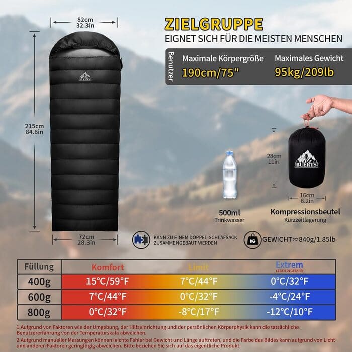 Im Rahmen eines funktionalen Einsatztests wurde der BUERTS Daunenschlafsack mit 680 Fill Power hinsichtlich Materialverhalten, Handhabung und Alltagstauglichkeit geprüft. Das verwendete 400T 20D Nylon-Außenmaterial zeigt sich mechanisch widerstandsfähig gegenüber Abrieb und weist eine griffige, hochwertige Haptik auf. Die Nähte sind gleichmäßig und sauber vernäht, versiegelte Ausführungen reduzieren Feuchtigkeitseintritt an kritischen Stellen. Die 400 g RDS-zertifizierte Daunenfüllung mit 80/20-Mischungsverhältnis liegt im marktüblichen Standard für die Mittelklasse und bauscht sich innerhalb von 10 Minuten nach dem Auspacken vollständig auf. Der Komfortbereich von 15 bis 7°C positioniert das Modell als Sommerschlafsack mit milder 3-Jahreszeiten-Tauglichkeit, während die Extremtemperatur von 0°C eine praxisnahe Sicherheitsreserve bietet.