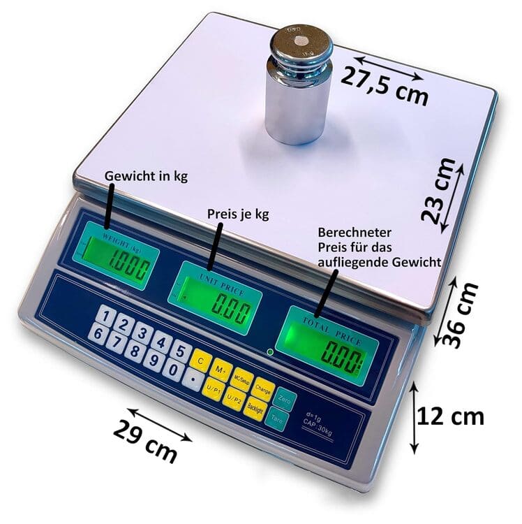 The design prioritizes functional clarity over aesthetic sophistication. The dual-display configuration—with front and rear LCD screens—enables simultaneous viewing by operator and customer, a feature typically found in mid-range segments rather than budget products at this price point. Six separate display fields structure weight, unit price, and total price information logically, reducing cognitive load during transaction processing. The compact dimensions of 33 × 16 × 39 cm integrate efficiently into standard retail counter environments without excessive footprint demands. The silver housing maintains visual neutrality across diverse workplace settings. Critical weaknesses emerge in sunlight conditions: display contrast diminishes significantly under direct solar exposure, limiting outdoor or window-adjacent placement. The single color variant offers no customization options, while the absence of design elements for rapid visual component identification (such as color-coded sections) complicates intuitive operation in low-light conditions.