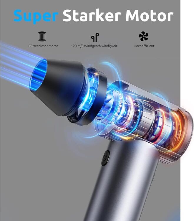 Die Bedienung erfolgt über Ein-Knopf-Steuerung mit Geschwindigkeitswechsel durch wiederholtes Drücken, was werkzeugfreie Anpassung an wechselnde Einsatzszenarien ermöglicht. Die integrierte LED-Beleuchtung durch die zentrale Öffnung verbessert Sichtbarkeit in schlecht beleuchteten Bereichen wie PC-Gehäusen oder Armaturenbrettern. USB-C Schnellladung eliminiert proprietäre Ladegeräte und vereinfacht Stromversorgung durch Kompatibilität mit Standard-Ladekabeln. Das Eigengewicht bleibt für kurze bis mittlere Einsätze von 10-15 Minuten handhabbar, führt jedoch bei längeren Arbeiten über 20 Minuten zu progressiver Ermüdung der Handmuskulatur. Die Lautstärkeentwicklung auf höchster Stufe erreicht erhebliche Pegel und verhindert Einsatz in geräuschsensiblen Umgebungen wie Büros oder Wohnräumen. Die fehlende deutsche Bedienungsanleitung erschwert Erstinbetriebnahme und Problemlösung für deutsche Käufer erheblich. Die hohe Luftgeschwindigkeit erfordert Vorsicht bei empfindlichen Komponenten wie Lüfterblättern oder losen Kabeln, da mechanische Beschädigungen möglich sind.