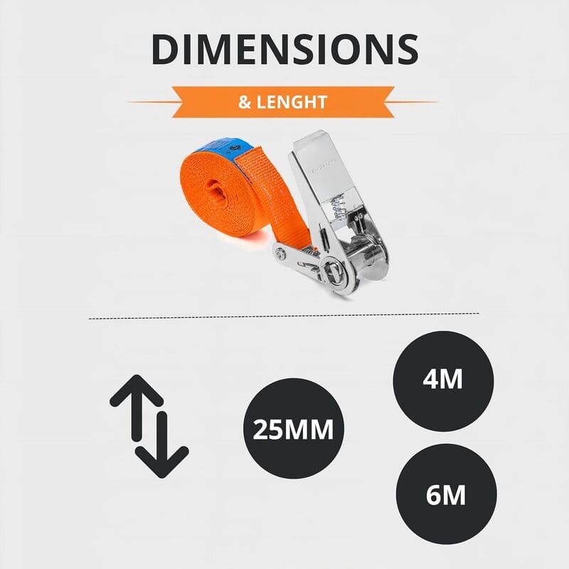 Die Größe & das Gewicht des Gurtsystems liegen mit 6 m Länge und einem Ratschenkörper von rund 13 cm im praxisnahen Bereich. Die Gesamtmasse pro Gurt beträgt ca. 0,25 kg, was bei Transport und Verstauung akzeptabel bleibt. Die Ratschen fallen vergleichsweise groß aus, was das Handling bei schweren Lasten erleichtert, jedoch das Packmaß erhöht. Die Gurte lassen sich schwer aufrollen und neigen zum Verdrehen – dies kann im mobilen Einsatz als nachteilig empfunden werden. Die Gurtbreite von 25 mm bietet einen stabilen, aber nicht überdimensionierten Zugpunkt für mittlere Anwendungen.
