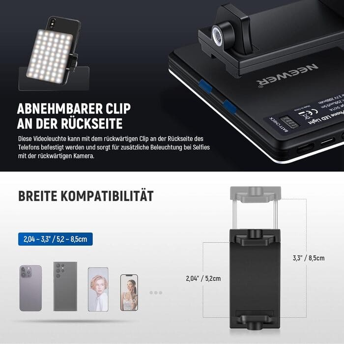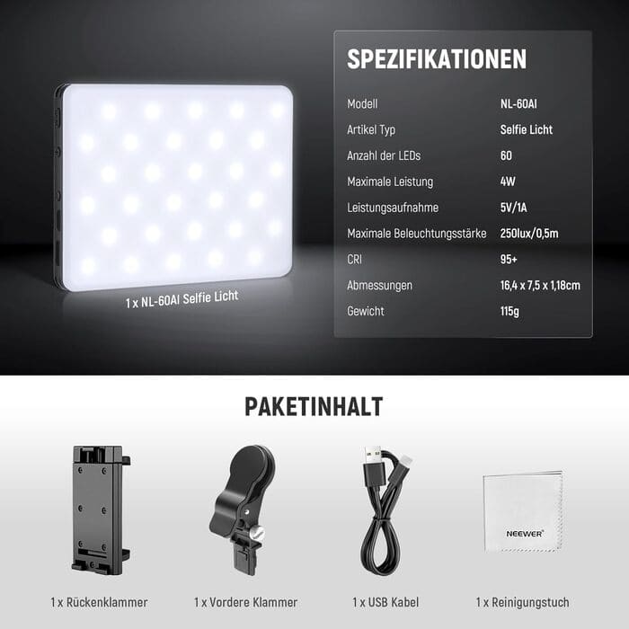 Im Rahmen eines praxisorientierten Einsatztests wurde die Neewer NL-60AI hinsichtlich ihrer Tauglichkeit für Home-Office, Content-Erstellung und mobile Videoanwendungen geprüft. Das kompakte LED-Panel mit 60 Leuchtdioden und 4 Watt Leistung richtet sich primär an Einsteiger und preisbewusste Nutzer, die eine unkomplizierte Beleuchtungslösung für Laptop- oder Monitor-Montage suchen. Die Klemmkonstruktion aus Metall gewährleistet einen stabilen Halt an Geräten bis 25mm Dicke, während das Aluminiumgehäuse bei nur 160g Eigengewicht eine angemessene Haltbarkeit bietet. Der CRI-Wert von 95+ sorgt für natürliche Farbwiedergabe ohne unerwünschte Farbstiche, und die einstellbare Farbtemperatur von 3200K bis 5600K deckt verschiedene Lichtsituationen ab.