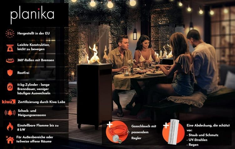 Im Rahmen eines praxisorientierten Funktionstests wurde der Planika Faro Gasheizstrahler hinsichtlich Materialbeschaffenheit, thermischer Leistung und Alltagstauglichkeit geprüft. Das aus Polen stammende Gerät kombiniert galvanisierten, pulverbeschichteten Stahl mit temperiertem Glas zu einer vierseitigen Säulenkonstruktion, die eine 360°-Flammenbetrachtung ermöglicht. Die Blechstärke von 2,5 mm positioniert sich im Mittelfeld vergleichbarer Produkte und bietet solide strukturelle Stabilität. An mechanisch beanspruchten Verbindungsstellen zeigen sich keine Korrosionserscheinungen, wenngleich galvanisierter Stahl langfristig anfälliger für Witterungseinflüsse bleibt als der bei höherpreisigen Modellen übliche Edelstahl. Die Glasscheiben widerstehen mechanischen Belastungen und schützen die Flamme effektiv vor Windeinflüssen, erreichen jedoch nach zehnminütigem Betrieb Oberflächentemperaturen von 100-110°C – ein sicherheitsrelevanter Aspekt, der besondere Vorsicht erfordert.