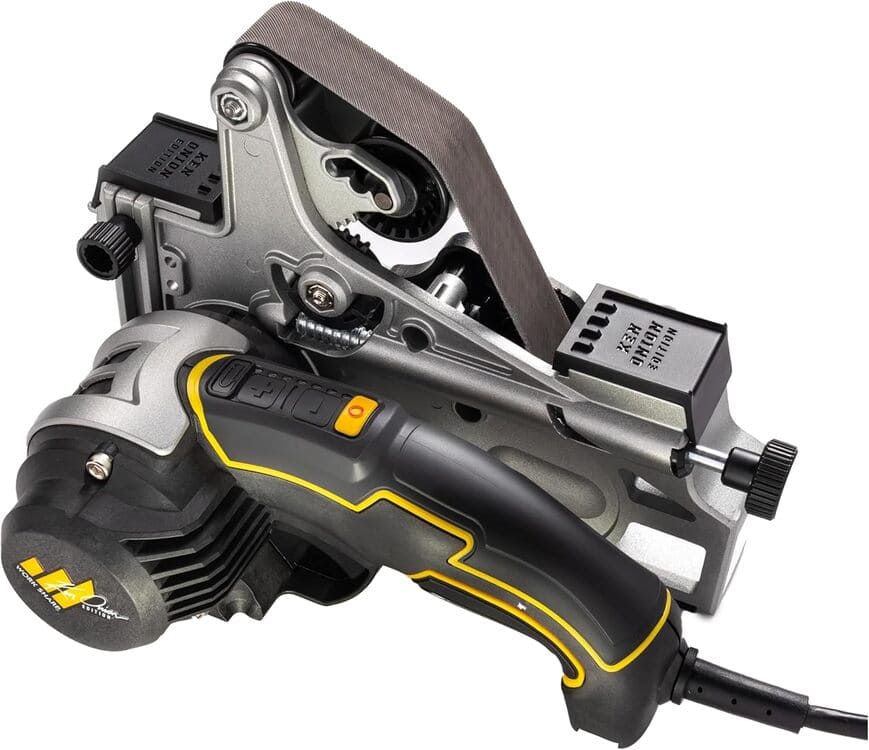 Ein Werkzeugschärfer, der zwei Welten zusammenführt: Die geführte Einheit sorgt für reproduzierbare Winkel, der freihändige Bandschliff schenkt Profilfreiheit. In dieser Kombination liegt der Charakter des Systems. Die Maschine tritt kompakt auf (28 × 17 × 18 cm), mit ruhiger Basis und einer klaren Bedienlogik, die weder verspielt noch kryptisch wirkt. Leder-ausgekleidete Auflagen verhindern Kratzer, die flexiblen Bänder passen sich an. Das Ergebnis ist ein Arbeitsgefühl, das man bei All-in-one-Lösungen selten findet: kontrolliert, mechanisch ehrlich, ohne die Illusion, der Prozess ließe sich per Knopfdruck automatisieren.